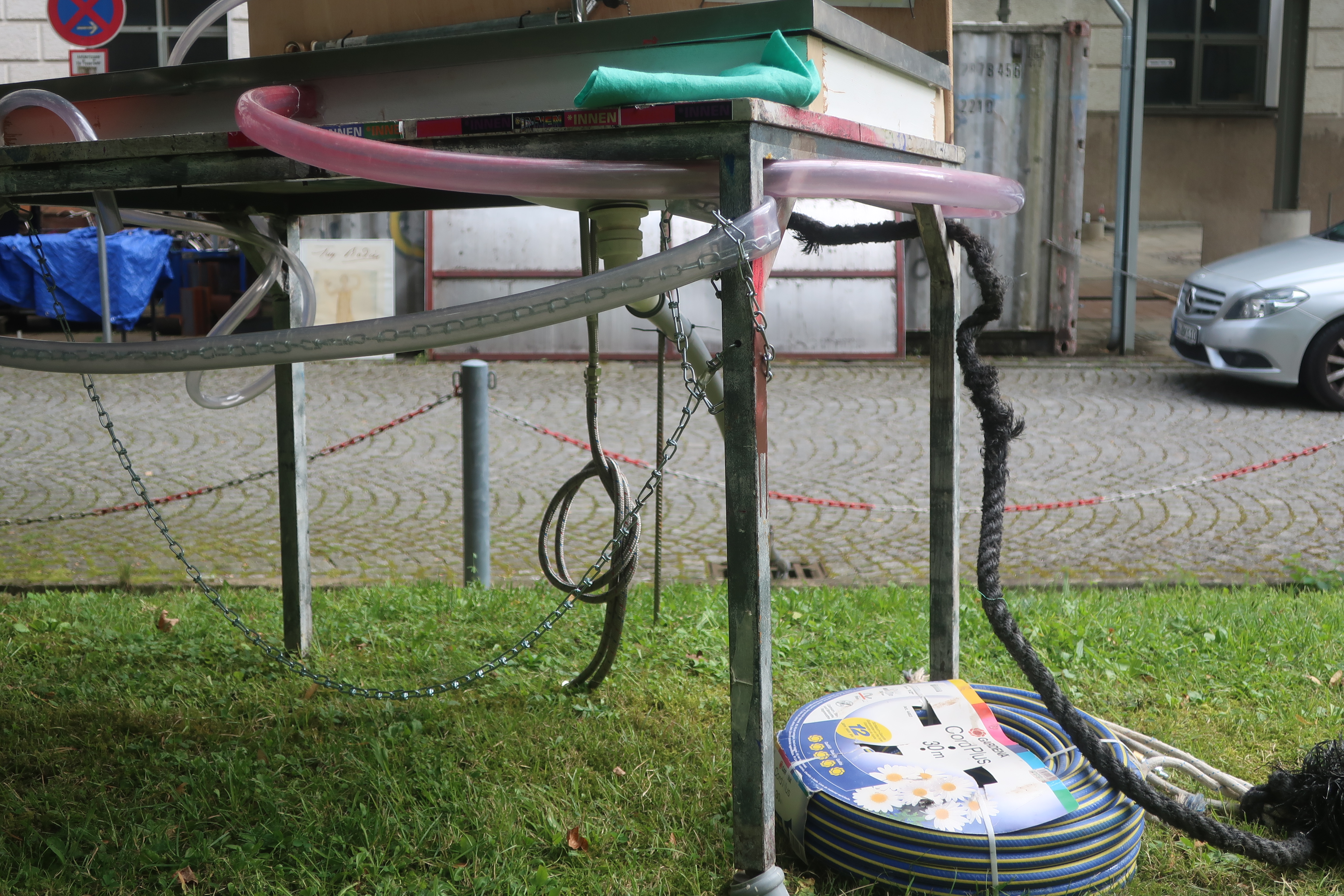Schnell weg von der Wucht des Ausstellungsalltags hin zum Etwas-Pausemachen, Teetrinken, Verweilen, Sein im Akademiegarten. Dort ist unsere Plattform. Alles was Du siehst hat eine alte Haut, aber ist neu für Dich. Ein Ort mit Performances und Konzerten, zum Sitzen und Teetrinken, gebaut aus Trümmern des Alltags, aus wiederverwendeten Materialien, die auch nach der Ausstellung wieder und wieder verwendet werden.